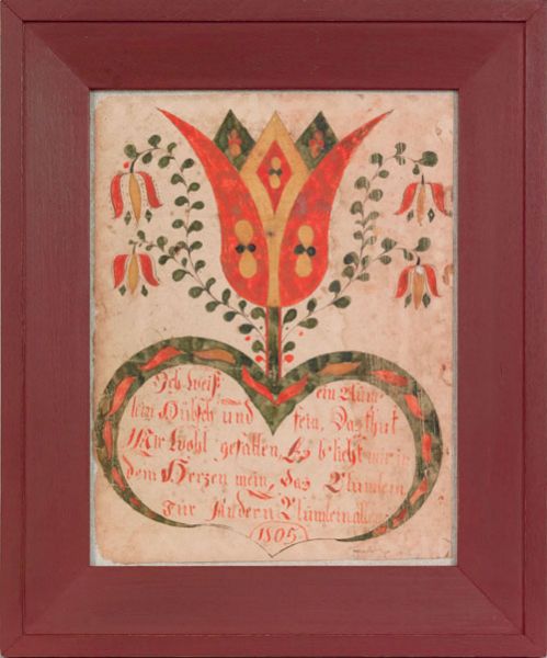 | Fraktur drawing with large orange, green, and yellow tulip tree emanating from a heart | |