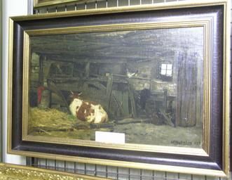 Ladugårdsinteriör med ko och höna