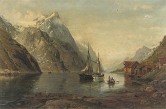 Anchored sailing-vessels in a fjord