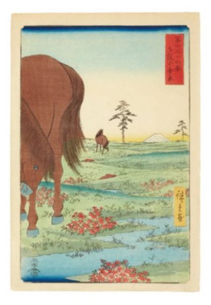| Koganegahara La plaine de Kogane Au premier plan, on voit un cheval brun près d'un ruisseau bordé de fleurs rouges | |