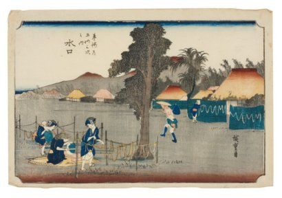 Minakuchi Un voyageur torse nu traverse un village situé sur la route du Tokaido