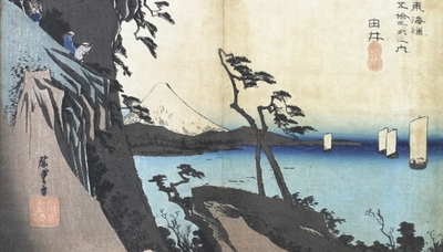 | Mount Fuji, with figures on a rocky path, and sailboats in the foreground, | |