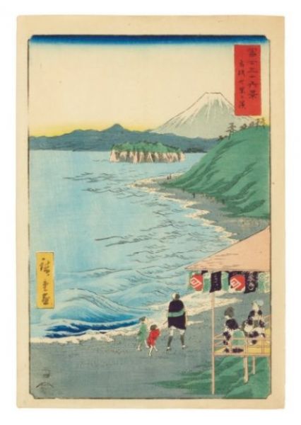 | Sagami Shichirigahama La côte de sept lieues dans la région de Sagami Au premier plan, une buvette au bord de l'eau où se tienne | |
