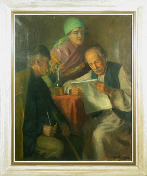Bauernfamilie, um einen Tisch versammelt, beim Lesen eines Briefes