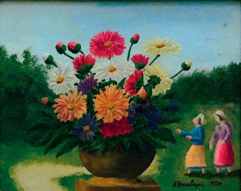 | Deux femmes à droite d'un grand vase de fleurs. | |