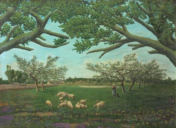 GARDIENNE DE MOUTONS DANS UN VERGER