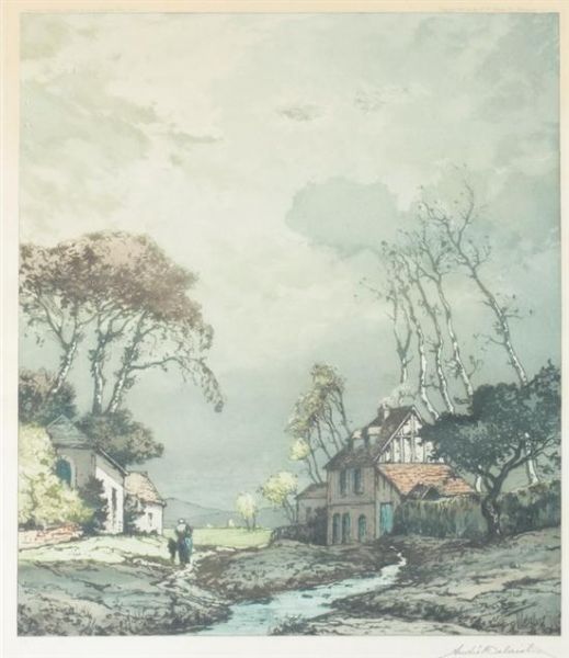 | PEASANT WOMAN WALKING ON TRAIL LEADING FROM A CREEK, WHICH RUNS BETWEEN TWO COUNTRY HOUSES | |