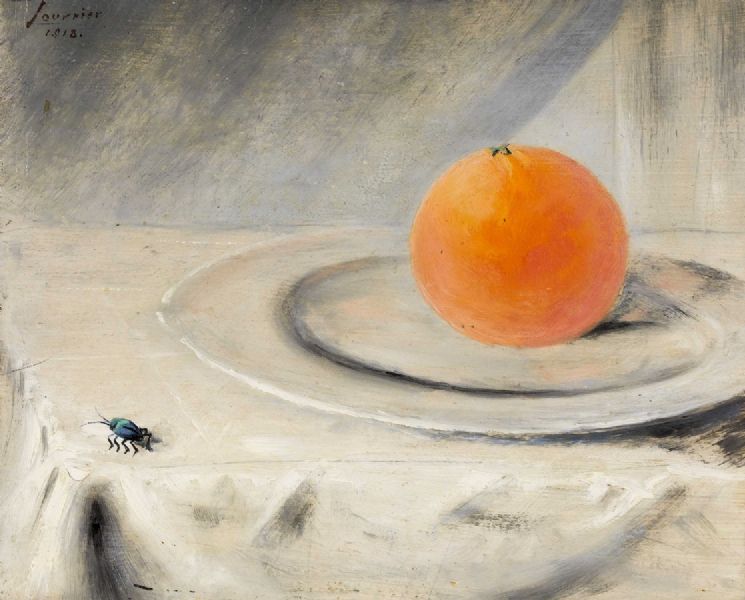 Stillleben mit Orange und Insekt.