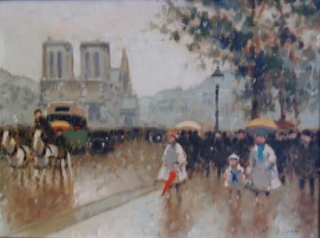 Bustling Parisian Street with Notre Dame in the Distance