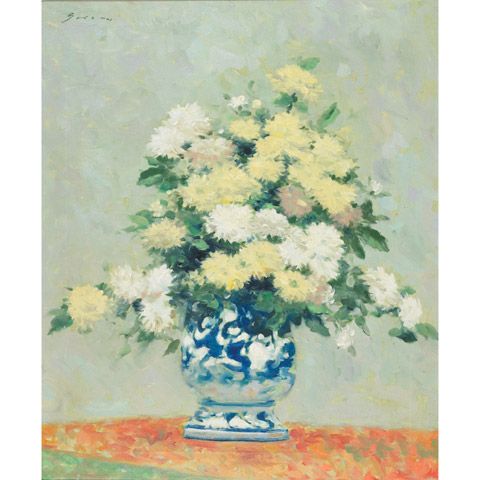 | WHITE AND YELLOW CHRYSANTHEMUMS IN A BLUE AND WHITE VASE | |