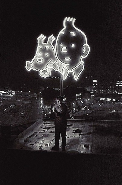 | Hergé allumant une cigarette sur le toit d'un immeuble à Bruxelles, où brillent Tintin et Milou. 25 août 1958. | |