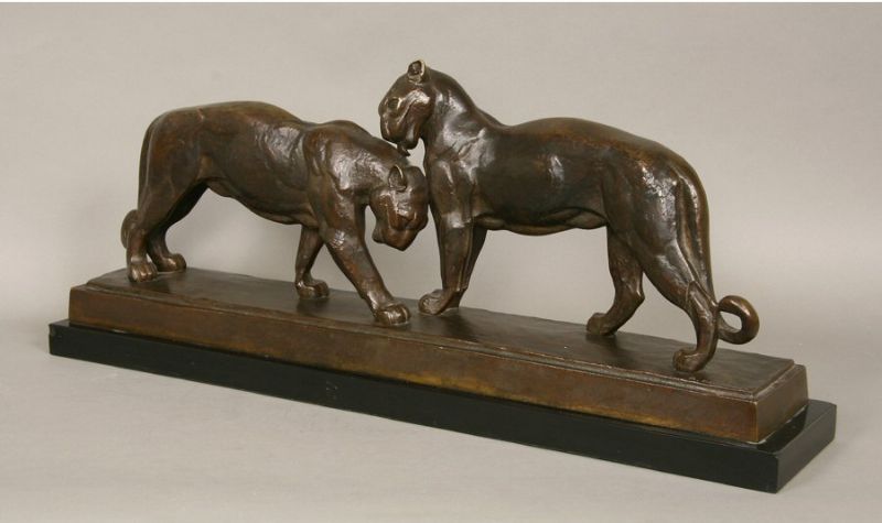 a pair of panthers resting on a slate base.