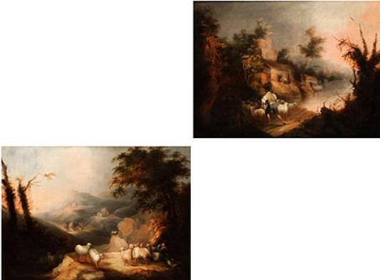 | LANDSCHAFT MIT SCHAFEN UND SCHLAFENDEM SCHÄFERsowie SCHÄFER BEIM HEIMTREIBEN SEINER SCHAFE | |
