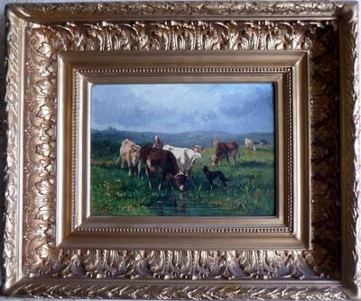 | Vaches au pâturage s'abreuvant à la mare et berger | |