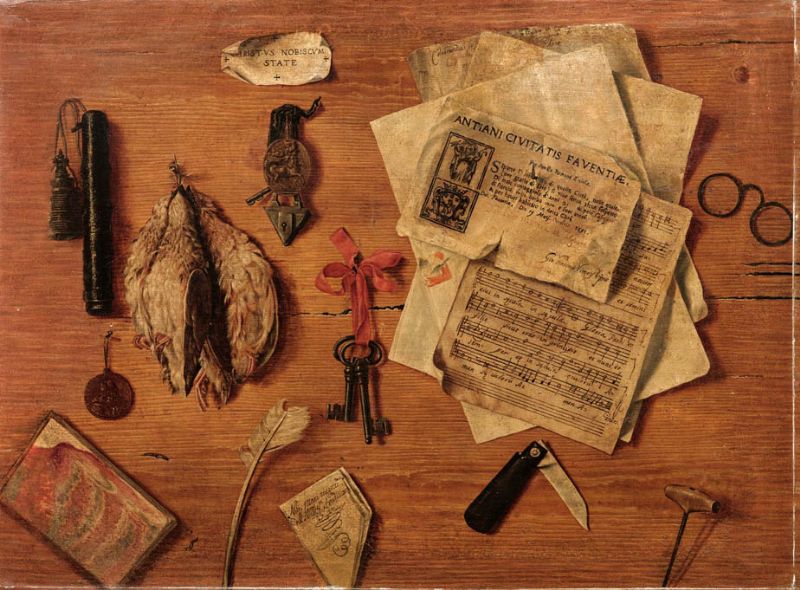 | Trompe l’oeil con chiavi, occhiali, foglio di musica, volatili e altri oggetti | |