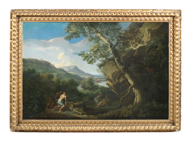 A wooded river landscape with shepherds observing bathers