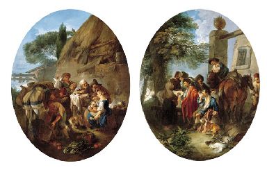 | Peasants eating and drinking by a cottage; and A hunting party resting in a wooded landscape | |