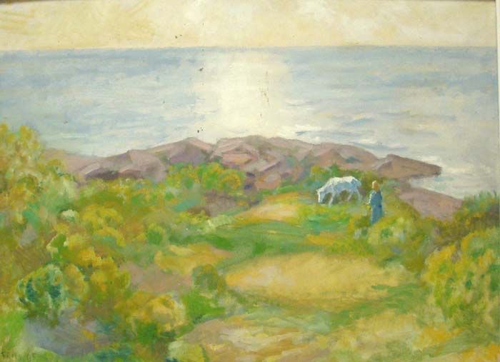 Sommerliche Küstenpartie mit Frau und Ziege