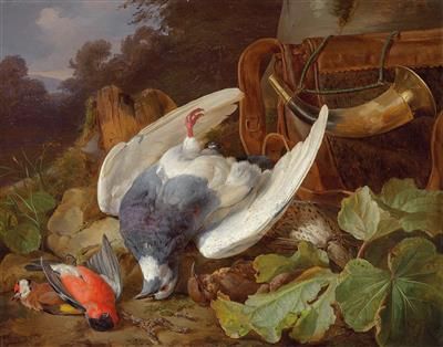 Jagdliches Stillleben vor Landschaftshintergrund