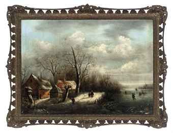 | Figures by cottages and ice skaters in a winter landscape | |