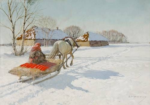 | A winter scene with a figure on a horse-drawn sleigh | |