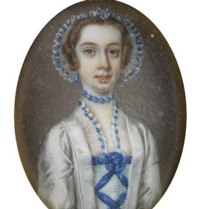 wearing white dress with blue trim, blue ribbon fastenings to her bodice and corsage, blue drop earrings and matching choker necklace, her dark hair upswept beneath a lace cap with blue trim | |