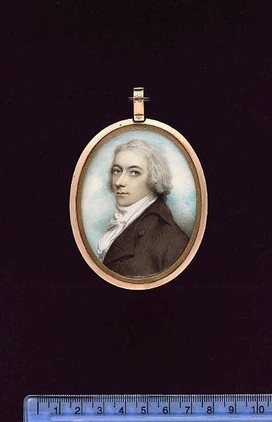 Sir Thomas Strachey, wearing brown coat, white waistcoat and tied white cravat, his hair powdered