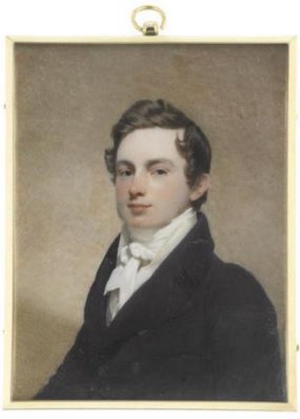 | A Young Gentleman of the Harwood family, wearing dark blue coat, white waistcoat, chemise, stock and tied cravat | |