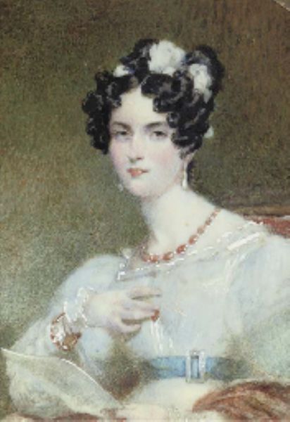 | Harriet, Countess of Guilford, seated in white dress holding a letter, coral necklace, white flowers in her upswept hair | |