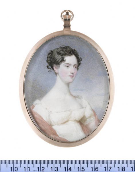 | Miss Gordon of Carroll, wearing ivory dress with lace trim to her décollage, pink stole, her dark hair upswept and curled. | |