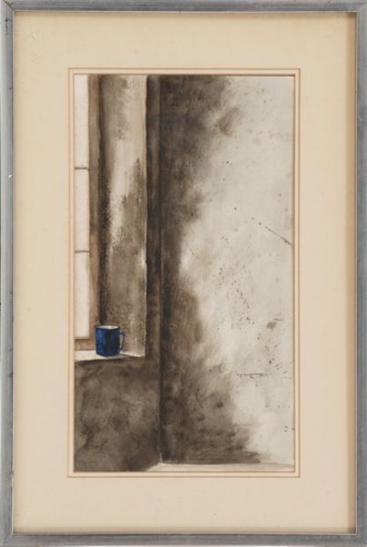 Depicting a blue mug on a bare windowsill