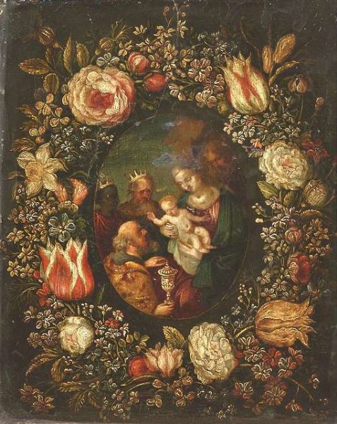 A girdle of flowers around a medallion with the adoration of the three Mag