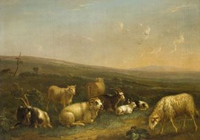 SCHAFE UND ZIEGEN IN ABENDLICHER HEIDELANDSCHAFT