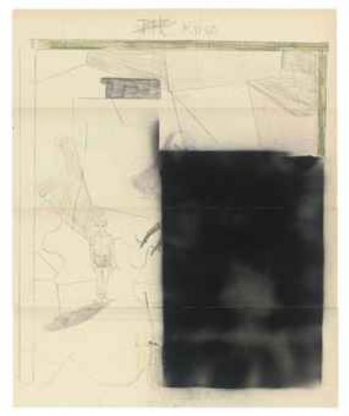 | Graphite wax crayon, watercolour and enamel spray on paper | |