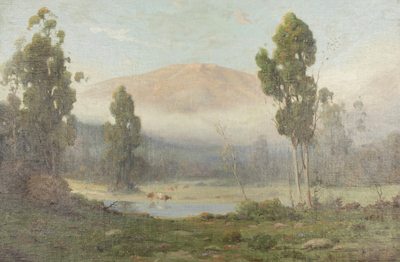 ''Euclayptus Mist'', cows watering in a mountain landscape