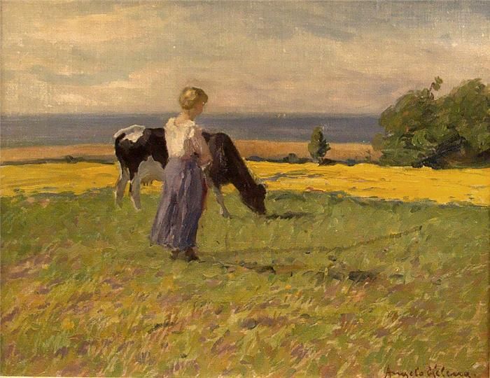 Sommerliche Meeresküste mit Bäuerin und grasender Kuh