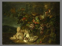 STILLEBEN MIT TAUBEN, WACHTELN UND TRAUBEN