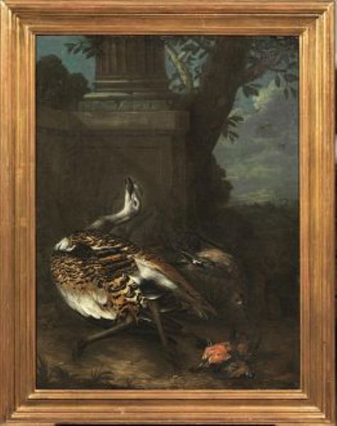 | CACCIAGIONE CON OTARDA E PICCOLI UCCELLI AI PIEDI DI UNA COLONNA | |