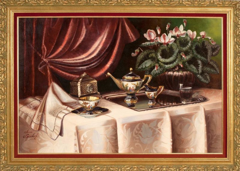 Still life with French porcelain tea set and cyclamen
