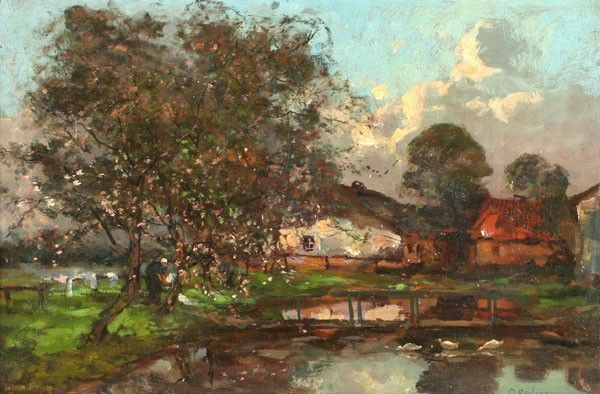 | Boerenhof met bloeiende boom en vijver, waarin enkele eendjes | |