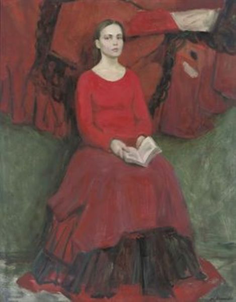 | Portrait of a lady, full-length, seated in a red dress holding a book | |