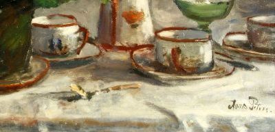 Stuttgart Gedeckter Tisch mit Kaffeegeschirr, Kuchen und Topfpflanze
