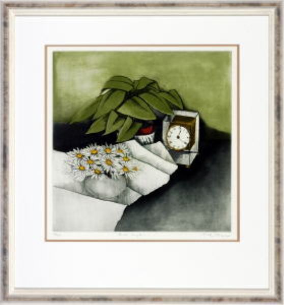 Stilleben mit Blumen und Tischuhr