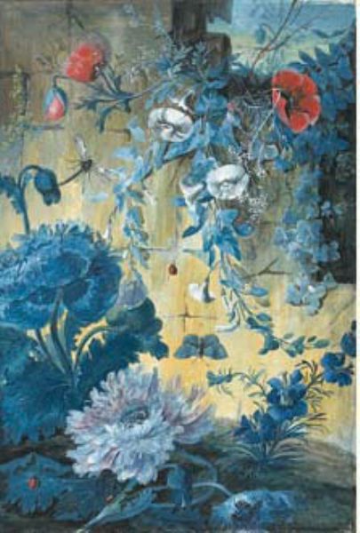 | Cascade de fleurs tombant le long d'un muret avec papillon, libellule et coccinelles | |