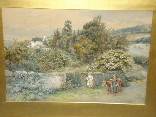 | Country lane with young lady and peacocks by a gate, together with another of young maids and a pony by a stone wall and gate wi | |