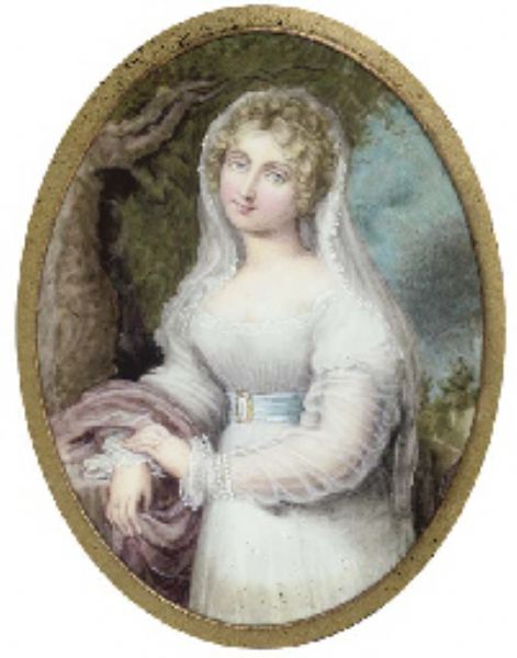 | A young lady, in white dress and falling veil, beside a tree; landscape background; and a lady in black dress and wearing a larg | |