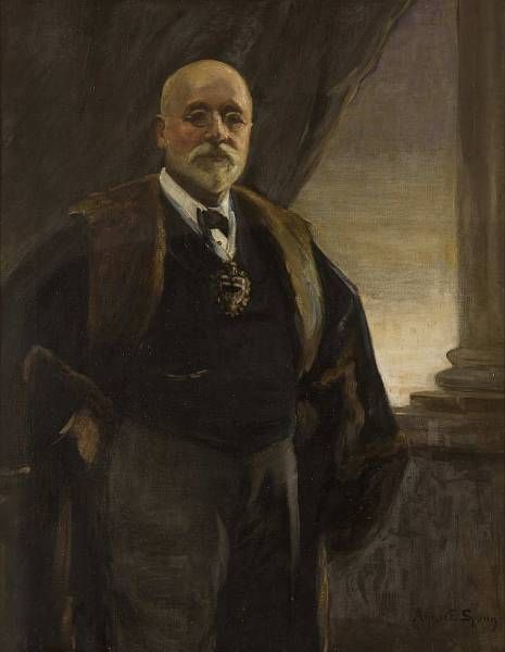 | Three quarter length portrait of J.E. Anderson, standing wearing mayoral badge beside a classical column, a drape behind | |