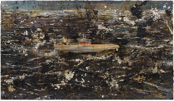 | Unknown paint, emulsion, shellac, straw on canvas, lead boat | |