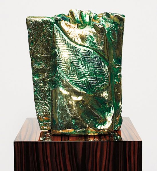 Bronze chrome, enamel, varnish on veneered makassar wood plinth