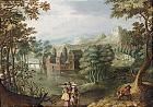 | A WOODED LANDSCAPE WITH TWO CAVALIERS AND A LADY CONVERSING BEFORE A LAKE, A PEASANT TO THE RIGHT | |